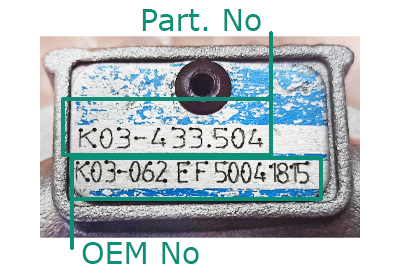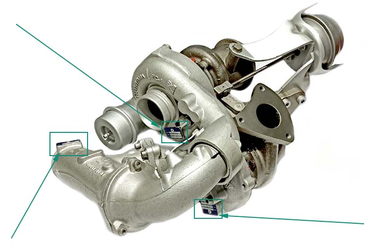 Чаще всего на турбокомпрессоре присутствуют два номера. В каталоге сайта рекомендуем осуществлять поиск именно по номеру производителя турбины («Part Number»), так как он является приоритетным.